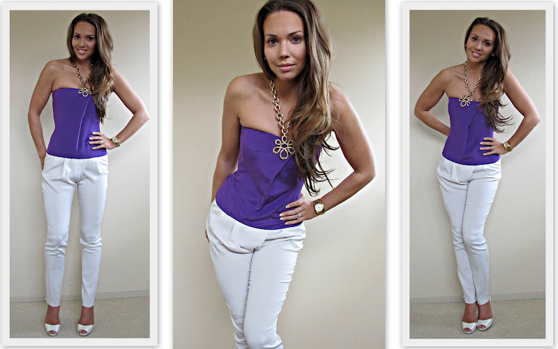 1.3.2011Kuten olen toistuvasti tämän blogin puolella todennut – värit puhuttelevat minua kovin tänä sesonkina. Vaikka värien rohkea yhdistely minua kiehtookin, en ole ollut niin uskalias että olisin vielä värikästä ylä- että alaosaa keskenään yhdistänyt. Täten aloitin kirkkaan liialla olkaimettomalla topilla, jonka yhdistin neutraaleihin valkoisiin housuihin. Kultaista yhdistin massiivisen kaulakorun sekä kellon avulla.