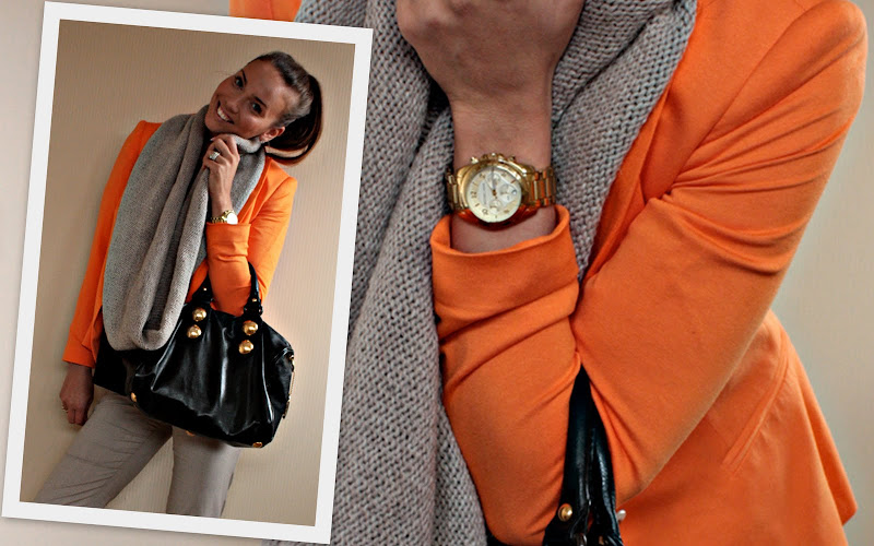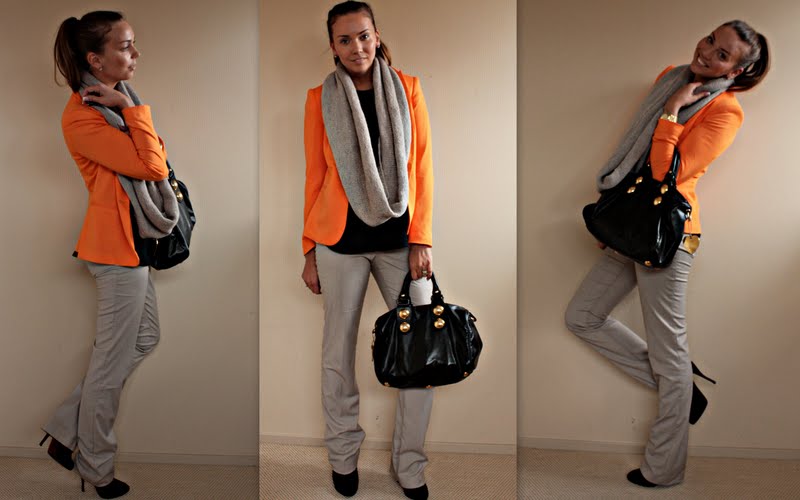 Bleiseri: Zara (olisin halunnut kirkkaan pinkkinä, mutta oli loppuunmyyty… kyllä tuo oranssikin ihastutti!) Musta pusero: Zara, Housut: Zara, Tuubikaulaliina: Äitini kutoma, Laukku: Gucci, Kello: Michael Kors, Kengät: Christian Louboutin