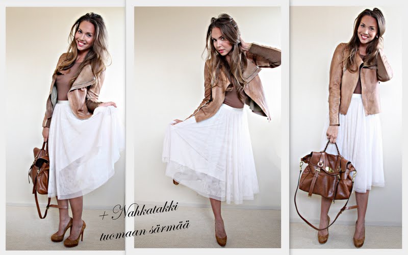 Oh! Tää on ihan mun lemppariasu! Toi nahkatakki antaa asuun kivasti särmää! Ihan mielettömän ihana tuo hame:))