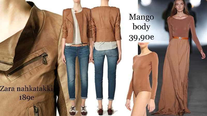 Bodya olenkin hetken etsinyt, mm. Wolfordilta. Mutta onnekseni Kamppi Keskuksen Mangoon oli juuri tullut lähetys ruskeita bodeja ja ystävälliset myyjät kävivät minulle omani varastosta hakemassa! Vielä tuo oikealla kuvassa näkyvä hame on kovasti minun mieleeni, mutta kukaan ei tunnu tietävän onko moista edes saatavilla. Netissäkään hameesta ei ole enempää tietoa. Se joka asiasta tietää enemmän – otan   innoissani infon vastaan!:)