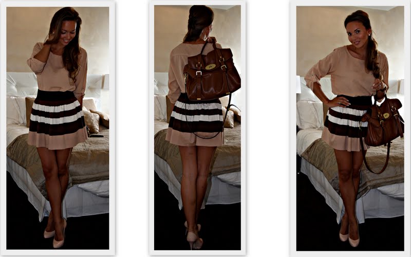 paita: Zara, hame: Zara, kengät: Giuseppe Zanotti, laukku: Mulberry