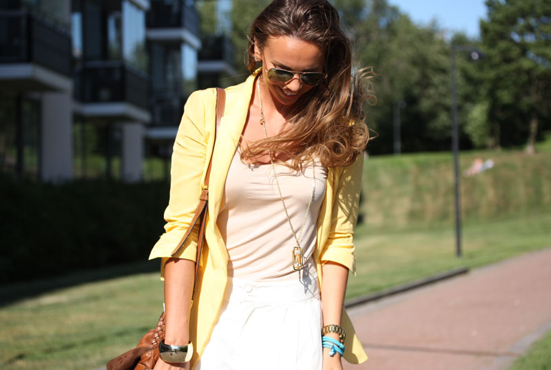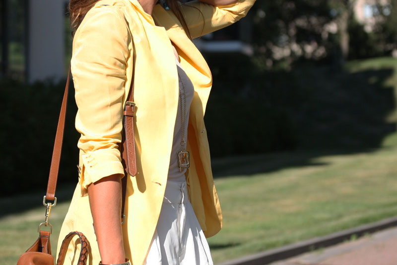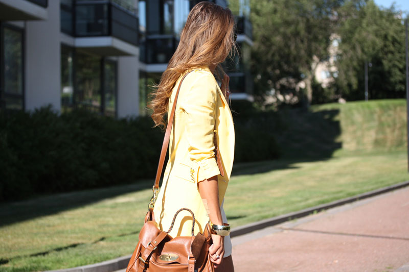 blazer: Mango, shorts: H&M, top: Philippa K, necklace: Snö of Sweden, blue bracelet: DFJ, watch: Michael Kors, golden bracelet: Gina Tricot, bag: Mulberry