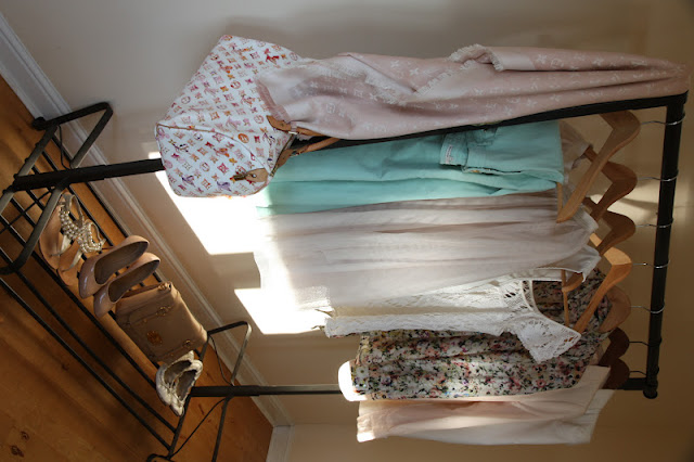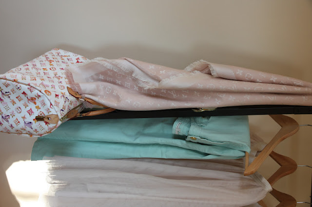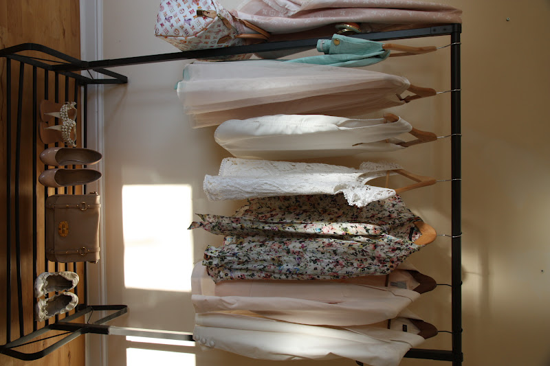 7.2.2012Noniin! Eli lupasin vielä lisää asukuvia niistä eilisistä mitunvihreistä housuista, mitä voisi käyttää jo melkeinpä lähiaikoina. Vietiin hiljattain autotallista jonkin verran vaatteita kierrätykseen ja sen möytä minulle vapautui yksi täsin tyhjä vaaterekki käyttöön. Kaikki vaatteeni roikkuvat/ovat viikattuina mukavasti omilla paikoillaan vaatehuoneessani, mutta innostuin hieman kuvailemaan omia pastellisia / niiden kanssa käyviä yksilöitä tällä vaaterekillä.