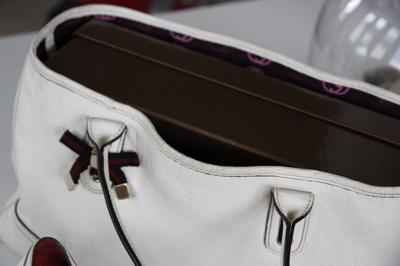 Valkoisten kenkien kanssa samaan sarjaan kuuluva valkoisesta nahasta tehty laukku – Gucci