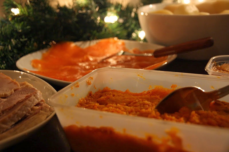 Täällä ollaan leikitty, pelailtu, katsottu telkkaria, nautittu perheen seurasta ja ennenkaikkea syöty! :) Apua, mun napa paukkuu niin kovasti ja pelkäänpä että repeän kohta:/ Me emme ole mitään suuria suomalaisten jouluruokien (siis laatikkojen) ystäviä, joten olemme kehittäneet ihan omat jouluperinneruokamme, mitkä ovat jo viimeisen seitsemän yhteisen joulun ajan joulupöytäämme koristaneet. Ne koostuvat osaksi herkuista, mitä perheemme tuo meille tänne ulkomaille, mitä niin kovasti aina kaipaamme.
