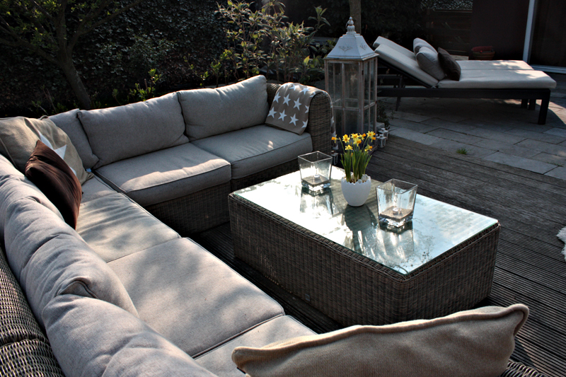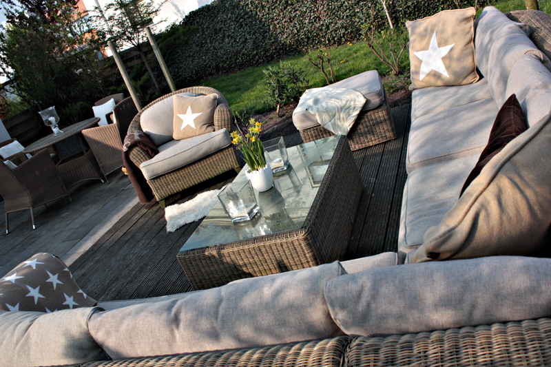 Sohvaryhmän merkki on Garden Impressions – niille joilla on myös vastaava sohvaryhmä hakusessa. Tämän kyseisen mallin lisähienous on siinä, että voit luoda tarpeisiisi sopivan kokoisen sohvan. Meidän kulma sohva koostuu 6 eri palasesta, jotka on pitävillä ruuveilla liitetty toisiinsa. Erinomaisesti ovat pysyneet paikoillaan eikä mitään rakoja ole syntynyt.