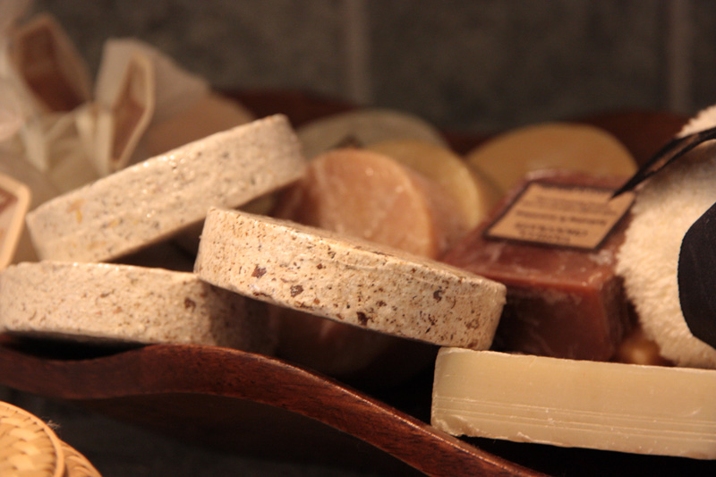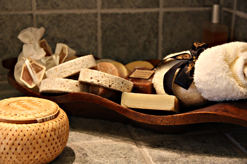 Näitä kauniita saippuoita äitini on ostanut sieltä täältä ja varmaan jotkut on poimittu ihan hotelleistakin mukaan viemisiksi? Ne hän on kauniisti asetellut näyttävään puuvatiin tyylikkään pyyherullan kera. On ne äidit sitten niin ihania :D