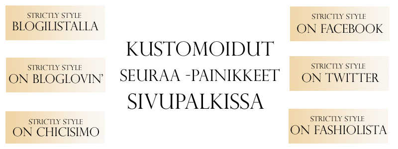 13.11.2011Suurin osa teistä onkin varmaan jo huomannut tuossa oikeassa sivupalkissa olevat kustomoidut “Follow Me” -painikkeet. Blogiani kun voi tätä nykyä seurata niin blogilistan, facebookin, twitterin, bloglovinin ja muutaman muun sosiaalisen sivuston kautta, tahdoin kehittää visuaalisesti kauniimman ratkaisun kuin ne palvelujen tarjoamat tunnukset, jotka tekivät sivupalkista ihan sillisalaatin näköisen. Täten hieman googlailin katsoakseni mitkä olivat mahdollisuuteni tämän suhteen. Yksinkertaisin ja toimivin ratkaisu oli, että luon itse haluamani “Seuraa”-kuvakkeet ja linkitän ne sitten kyseisiin palveluihin. Koska lukijoideni joukossa on myös paljon bloggaajia, ajattelin tehdä teille tämän pienen postauksen, missä opetan tämän helpon tekniikan teillekin.