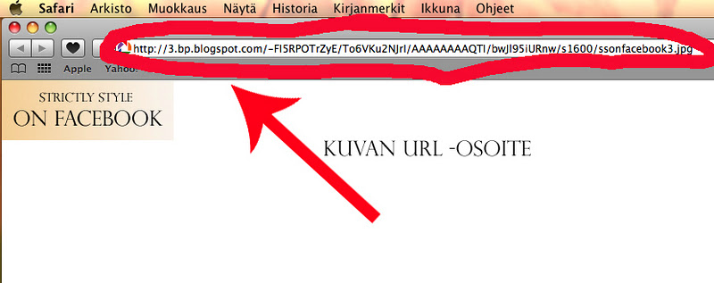 Nyt tarvitset enään html -koodin pätkän, mihin liität haluamasi kuvan URL -osoitteen sekä sen nettisivun osoitteen, jonne haluat kyseisen kuvan linkittää. Tässä tapauksessa se olisi minulla Strictly Style -blogin facebook sivu, eli http://www.facebook.com/strictlystylemrsv .